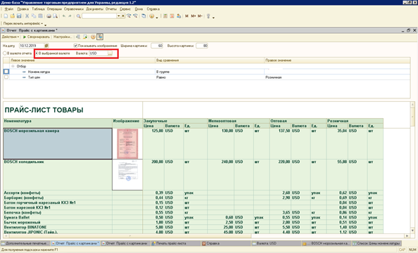 Ціни в звіті можливо отримати в валюті, яка визначена для ціни товарів в документі "Установка цін номенклатури" або в будь-якій довільній валюті, зареєстрованої в довіднику "Валюти".